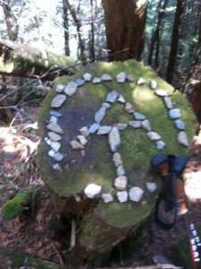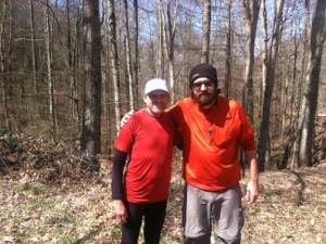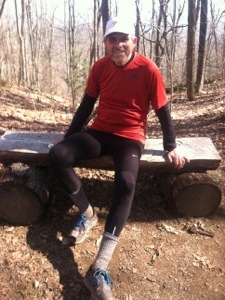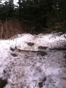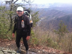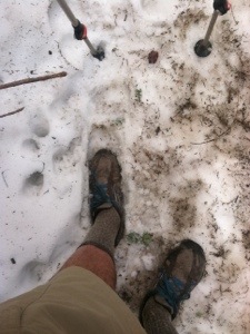 As the day wore on I ate and drank often, stopping twice to enjoy the turkey sandwich I had made at the Massey’s this morning. I also took numerous short breaks just to enjoy the views. Late in the afternoon I had to again deal with ice on the trail, although the trail was not as treacherous as yesterday. There I was hiking in short sleeves and shorts, with temperatures in the high 70’s, walking through ice and snow. Many times, however, I was able to walk around the more difficult stretches. Fortunately, I was able to stay vertical all day.
