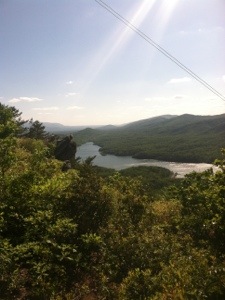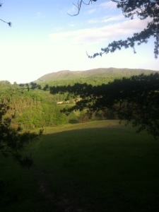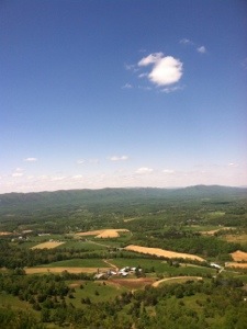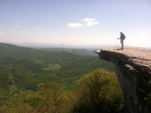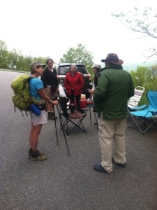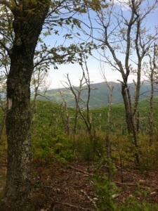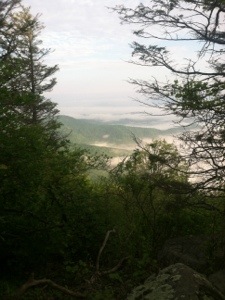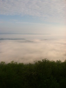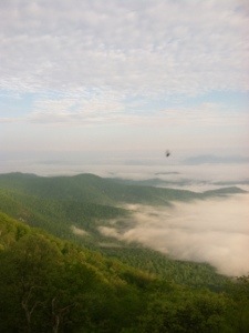 After packing up and drinking as much as possible of my Carnation Instant Breakfast concoction, I was on my way. A little quicker to pack up, War Cry beat me out of camp. With gentle terrain and a heel that hopefully is much better, I anticipated hiking the 14.6 miles to US 501 by 1:00. Early on I took a short break at the Thunder Ridge Overlook where Bill, an AT maintainer, was shooting some early morning photos of the clouds below the mountains. I took a couple of pics as well before moving on up the trail.
