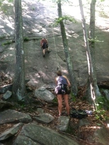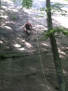 The most challenging part of today’s hike was hiking down St. John’s Ledges. I should say it was a bit of a challenge for me. John and Jimmy had expected something more technical. Near the end of that section we came across two rock climbers. Dave and Lacey had affixed a rope to a tree at the top of a rock face. Dave began the climb up as we watched. I sensed that John would have liked a turn, having done a little rock climbing himself. Unfortunately the hike needed to continue. And so we hiked on toward the Housatonic River.