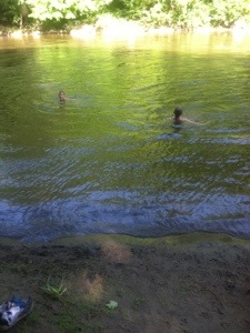For much of the final six plus miles the trail parallels the river. At one point my two companions decided a swim was in order. So for the second time in two days John has gone for a swim during my hike. I watched from the bank as John and Jimmy cooled off in the rippling water. After their swim we picked up the pace until a final climb commenced. I needed a short rest before we completed the last mile. Just before we reached CT 4 near Cornwall Bridge, we spotted Cooper walking up the trail to meet us. After a stop for a Mountain Dew, we headed toward the inn.