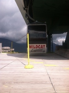 we were able to get back into the hiking regimen after what could be considered two days off. The flat terrain around a pond was short-lived. And when the climbing began, it was intense. The task was to ascend four peaks of Wildcat Mountain. The climb was over 2000 feet to the first, peak E. I have no idea how they are labeled; however, the second peak we reached was D. At the top of D were two picnic tables next to an operating gondola. During our break only one group arrived at the peak by this method. The gondola operator looked kind of lonely.