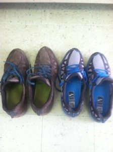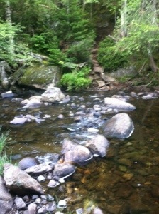 I must admit that I have been somewhat apprehensive over fording for some time. Today’s events, however, alleviated any fears. When I arrived at the first stream I removed my trail runners and socks and the put on my Vivobarefoot camp shoes. The flexibility of the plastic shoes made the crossings seem easy. At the West Branch of the Piscataquis, Goose and All the Way had arrived just before Molar Man and me, so I watched as they made their way across the wider river. A rope was affixed to trees on each side for balance. The water only came up to mid calf at the deepest part.